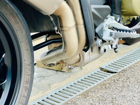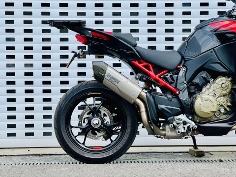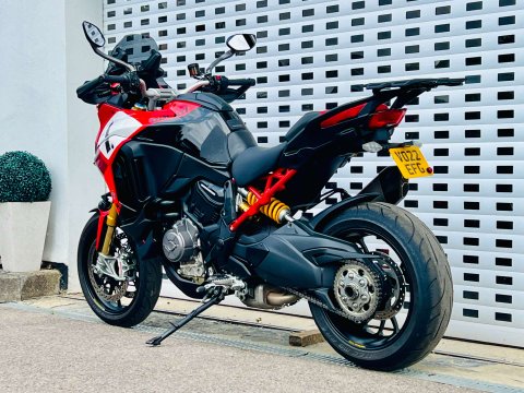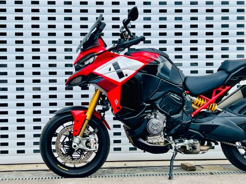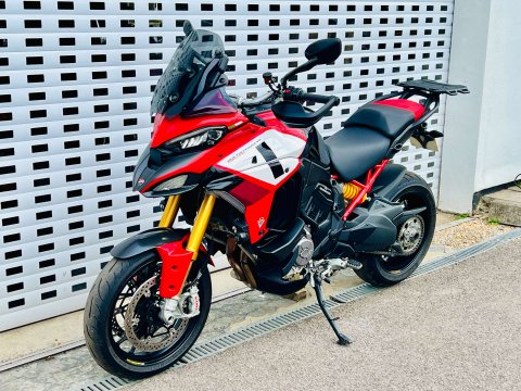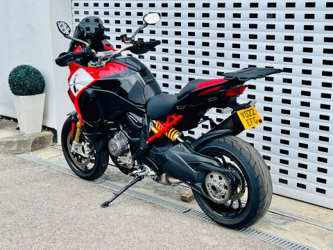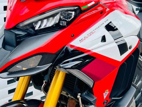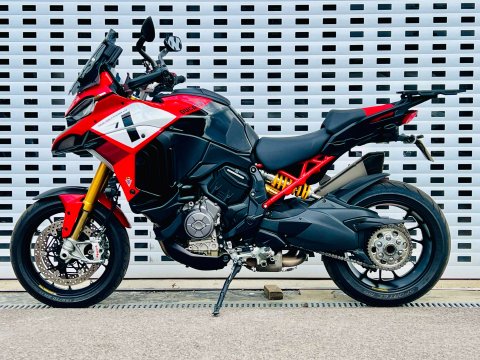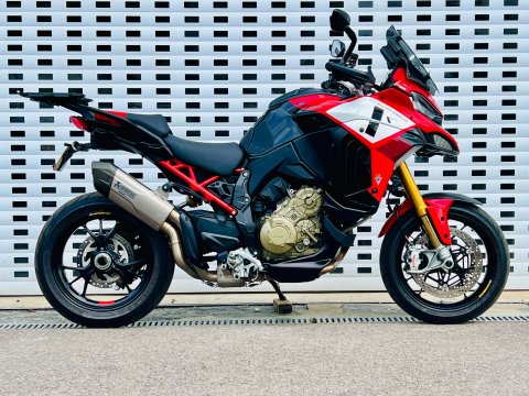 +++ JUST FURTHER REDUCED! +++ STUNNING DUCATI MULTISTRADA V4 PIKES PEAK IN GORGEOUS DUCATI RED WHITE & BLACK COLOUR SCHEME. THE RACE LIVERY MAKES NO HIDING THE EXTREME SPORTING INTENTION & RIDE QUALITY OF THIS BIKE. HOWEVER THE UPRIGHT RIDING POSITION LENDS BRILLIANTLY TO THE REQUIREMENTS OF THE MODERN DAY RIDER OR LONG DISTANCE TOURER. THE VERY HIGH SPEC INCLUDES; AKRAPOVIC CARBON TIP SILENCER, SPORTS FRONT PIPES WITH DEDICATED MAPPING, Öhlins Smart-EC 2.0 Electronically Adjustable suspension, Adaptive Cruise control, blind spot monitoring, a suite of Riding modes with road sport orientation unique to this and the RS model, Lovely two-tone Red/black seat, High end Brembo brakes, 17" Front wheel to add to the precise handling character, Forged aluminium Marchesini wheels shod with Pirelli Diablo Rosso road tires, adjustable smoked windscreen, multiple safety rider aids inc Ducati Wheelie Control and lean-sensitive traction control, single-sided swingarm, heated grips. Exhaust hanger plus original pillion pegs and mainstand included also.